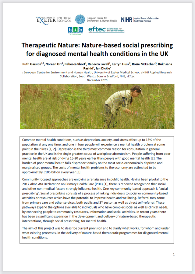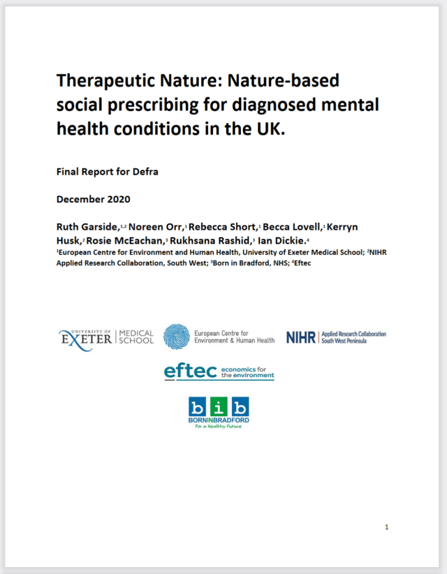 […] on previous work by the team including the Nature on Prescription Handbook funded by the MRC, and a report on Therapeutic Nature written for Defra. This project is also supported by The National Institute for Health and Care Research (NIHR) […]