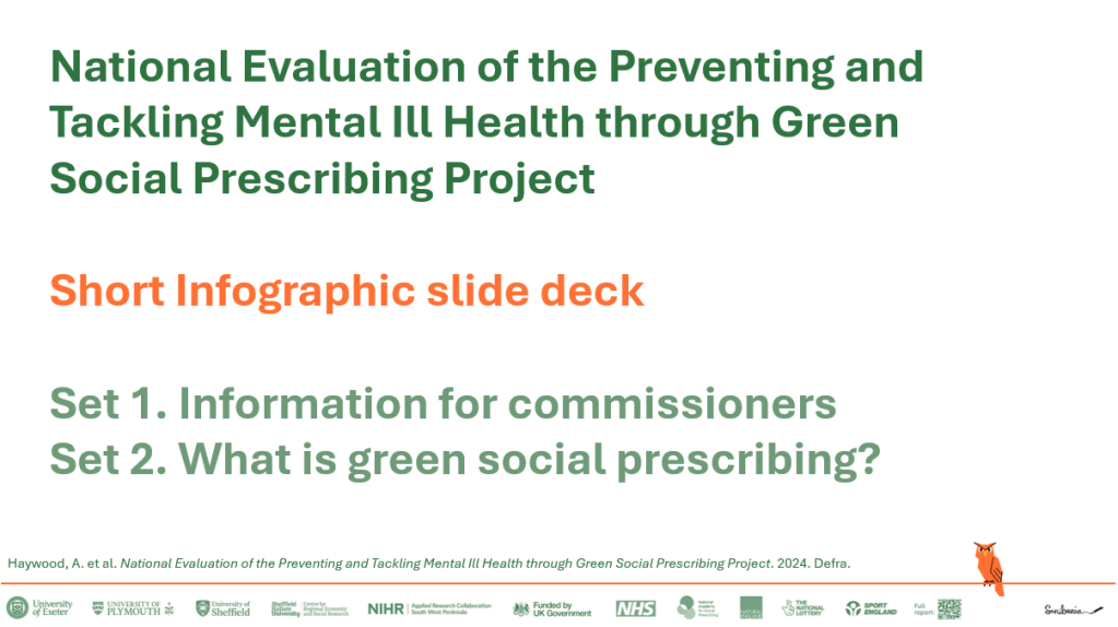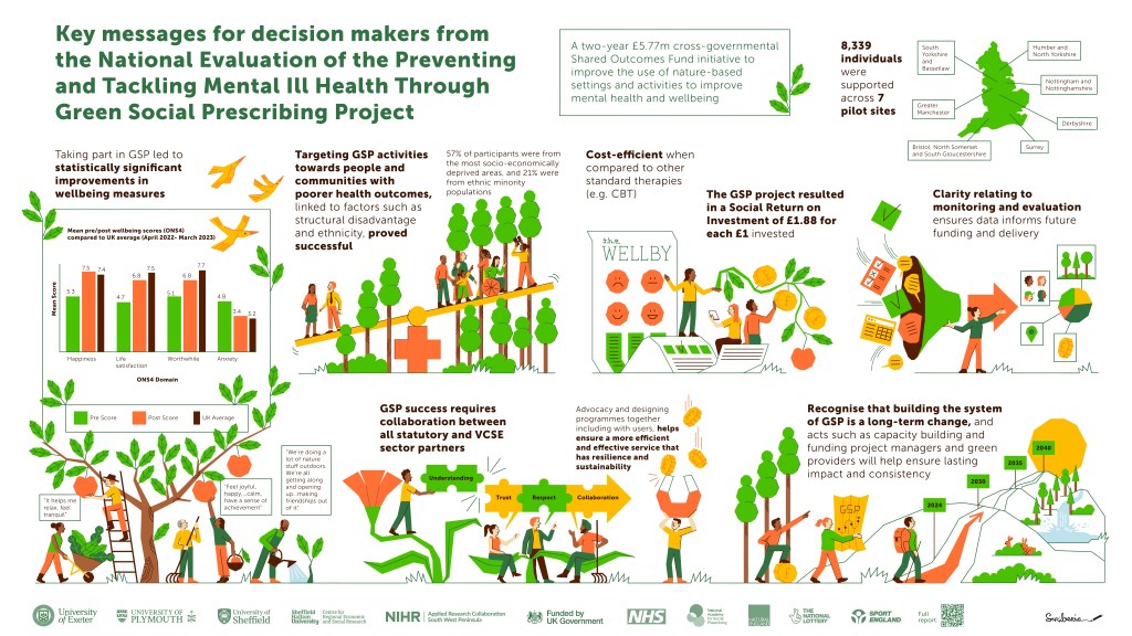 Two infographics were produced, the first to illustrate key messages for decision makers, the second to explain what Green Social Prescribing is in clear and easy to access language.